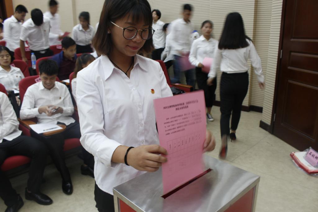 会议最后,李霞老师进行了总结发言,她对此次会议做出高度评价。她讲到,学院团学代表大会的组织与开展已逐步走向规范化,使得学生干部的选举做到了公开、公正、透明。同时,她也希望永利官网的各类学生活动能够越办越好。最后,学院第二次团学代表大会在雄壮有力的《光荣啊,中国共青团》歌声中圆满闭幕。