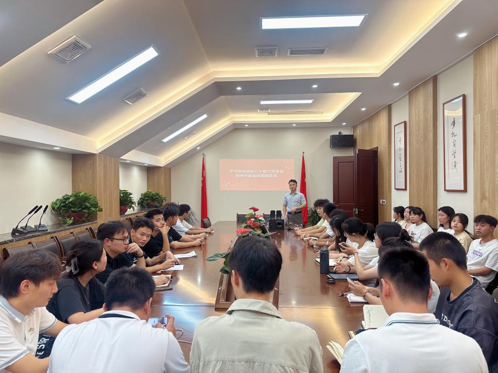 20249月中旬,学生党支部在体育馆117开展专题党课宣讲党的二十届三中全会精神,学生党支部全体党员、预备党员、入党积极分子代表参会,党委副书记靳浪担任主讲。