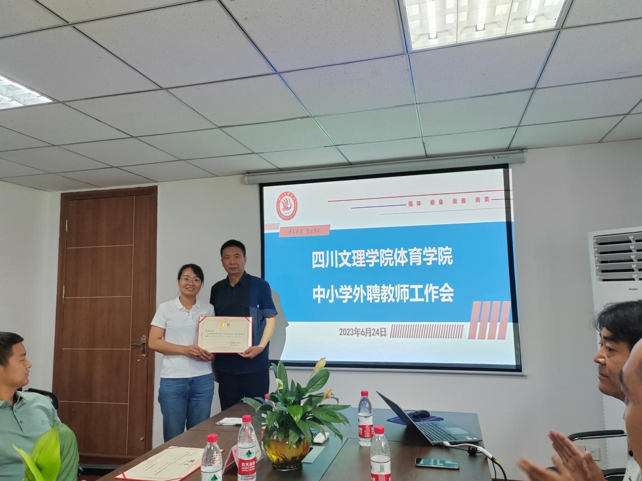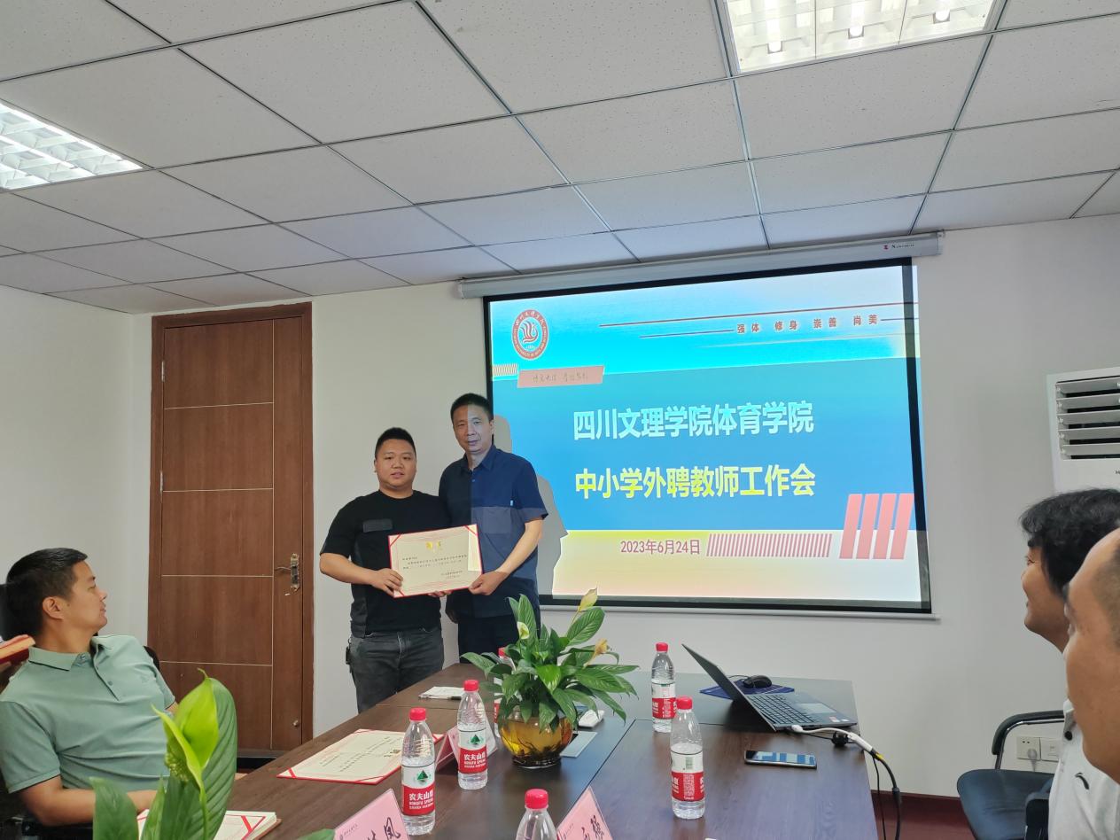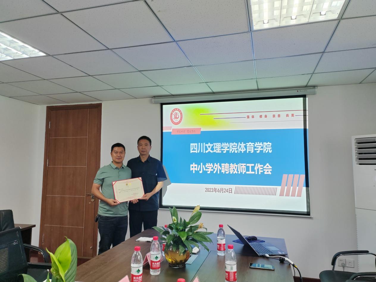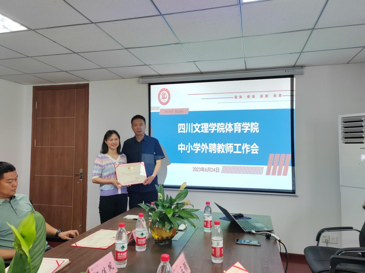 佘涛院长对永利yl23411官网的办学历程及基本情况进行了简要介绍,并代表学院感谢大家在学院发展中给予的大力支持。他汇报了学院体育教育专业认证工作的推动情况。他指出,师范专业人才培养质量评价的重要依据是师范生和用人单位的满意度,为对接社会需求,提升人才培养质量,学院特聘部分中小学优秀体育教师和专家作为学院体育教育专业的外聘教师。随后,院长佘涛、副院长孙亮亮为向珏璞、冉香山、杨曲、郎佳凤四位中小学优秀教师颁发了聘书。并围绕中小学体育教育课程标准、体育教育人才需求、中小学体育教育现状及困惑,与会老师进行了深入的交流。
