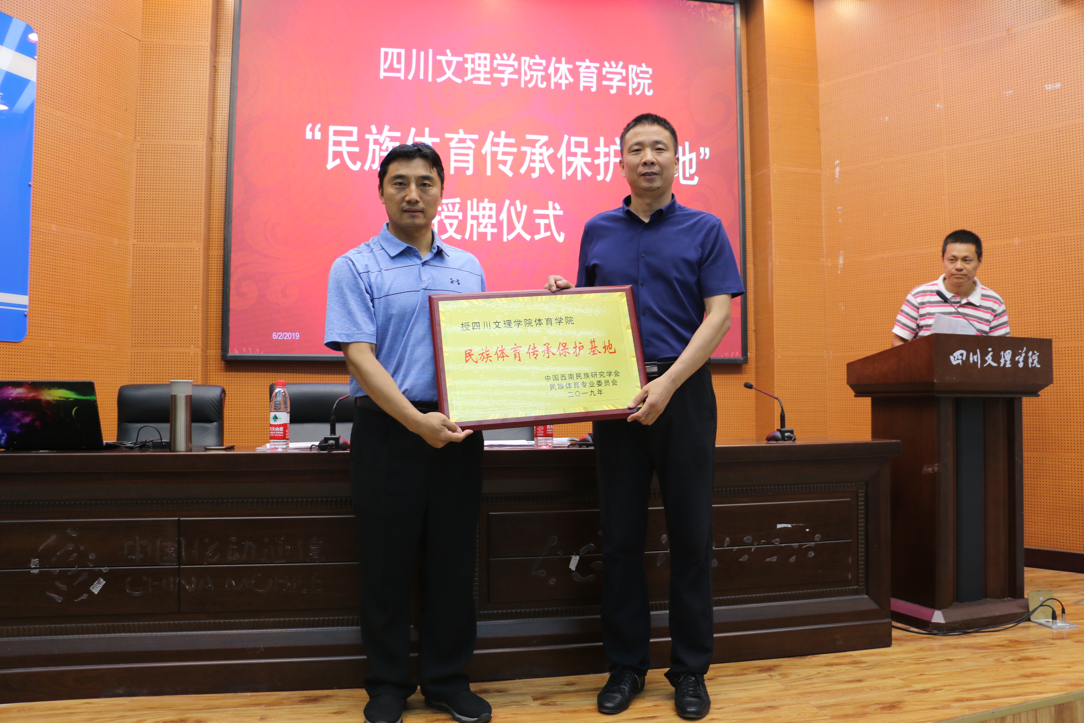 讲座伊始,首先进行“民族体育传承保护基地”授牌仪式,由成都永利yl23411官网陈振勇教授为永利官网院长佘涛教授授牌。其次,陈教授讲解了如何理解我们的民族传统体育文化,并分析了民族传统体育文化保护研究的领域等内容。最后,陈教授提出三点希望:一是希望同学们认真领会讲座内容;二是希望同学们积极的探索武术与民族传统体育的新模式新方向;三是希望同学们努力成为一名合格的武术专业人才。
