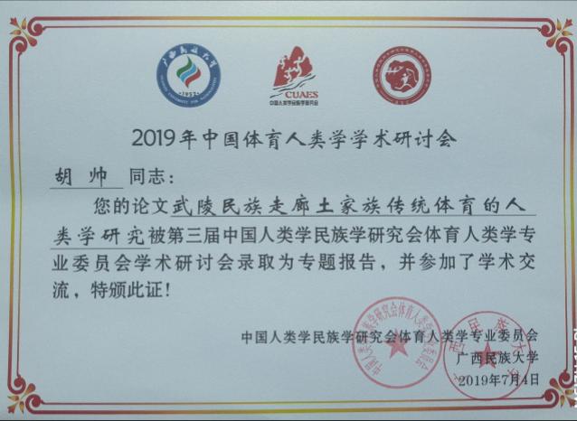 2019年7月3日至7日,第三届中国体育人类学学术研讨会在广西民族大学举行。永利官网青年教师胡帅所投的《武陵民族走廊土家族传统体育的人类学研究》被录取为专题报告,并进行了专题发言。