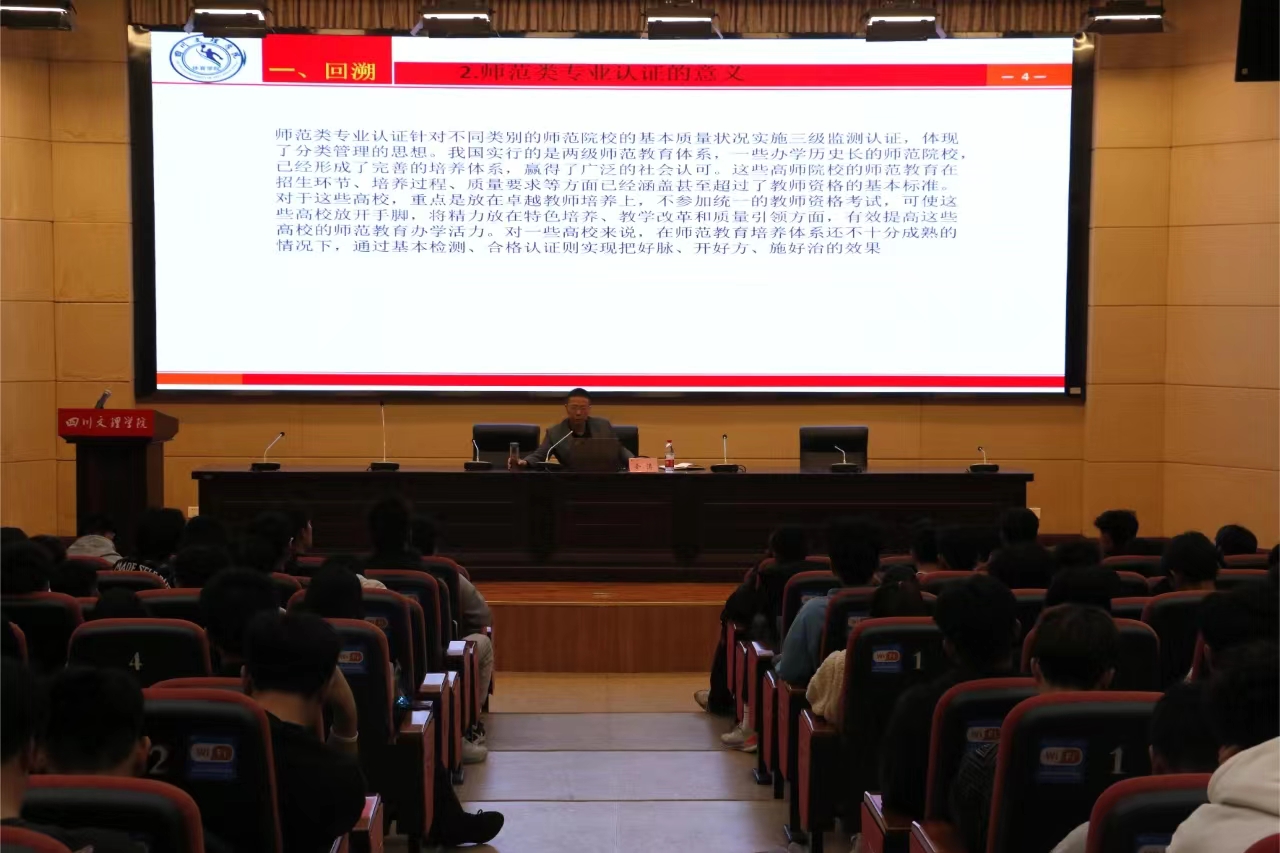 最后,孙亮亮教授做了总结发言。他指出,佘涛教授治学严谨,讲座内容丰富,理论联系实际,对当前的认证工作极具指导意义。他强调,师范专业认证既是对我们专业的一次体检,也是专业发展的一次指导,全院师生要站在学院发展和提升人才培养质量的高度,重视和参与认证工作。