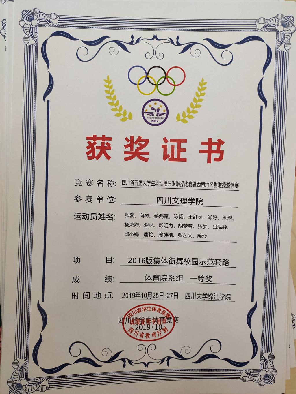 四川省首届大学生舞动校园啦啦操比赛暨西南地区啦啦操邀请赛在四川大学锦江学院隆重举办。永利yl23411官网谢林,向琴,陈畅,张蕊,刘琳等十八名同学组队在教练唐绪明老师的带领下代表学校参赛。赛前,教练唐绪明老师牺牲了大量的休息时间悉心指导,学院许汝霞老师也给予了及时的帮助,同时,队员们发扬“艰难困苦,玉汝于成”的文理精神刻苦训练。在比赛中,队员们发扬团队拼搏的精神,以饱满的激情和精湛的技艺,赢得了观众的喝彩和评委的好评。在2016校园啦啦操街舞示范套路和2016版校园啦啦操花球示范套路两场比赛都获得了体育院校组的第一名好成绩。唐绪明老师也获得“优秀裁判员”和“优秀教练员”的荣誉。