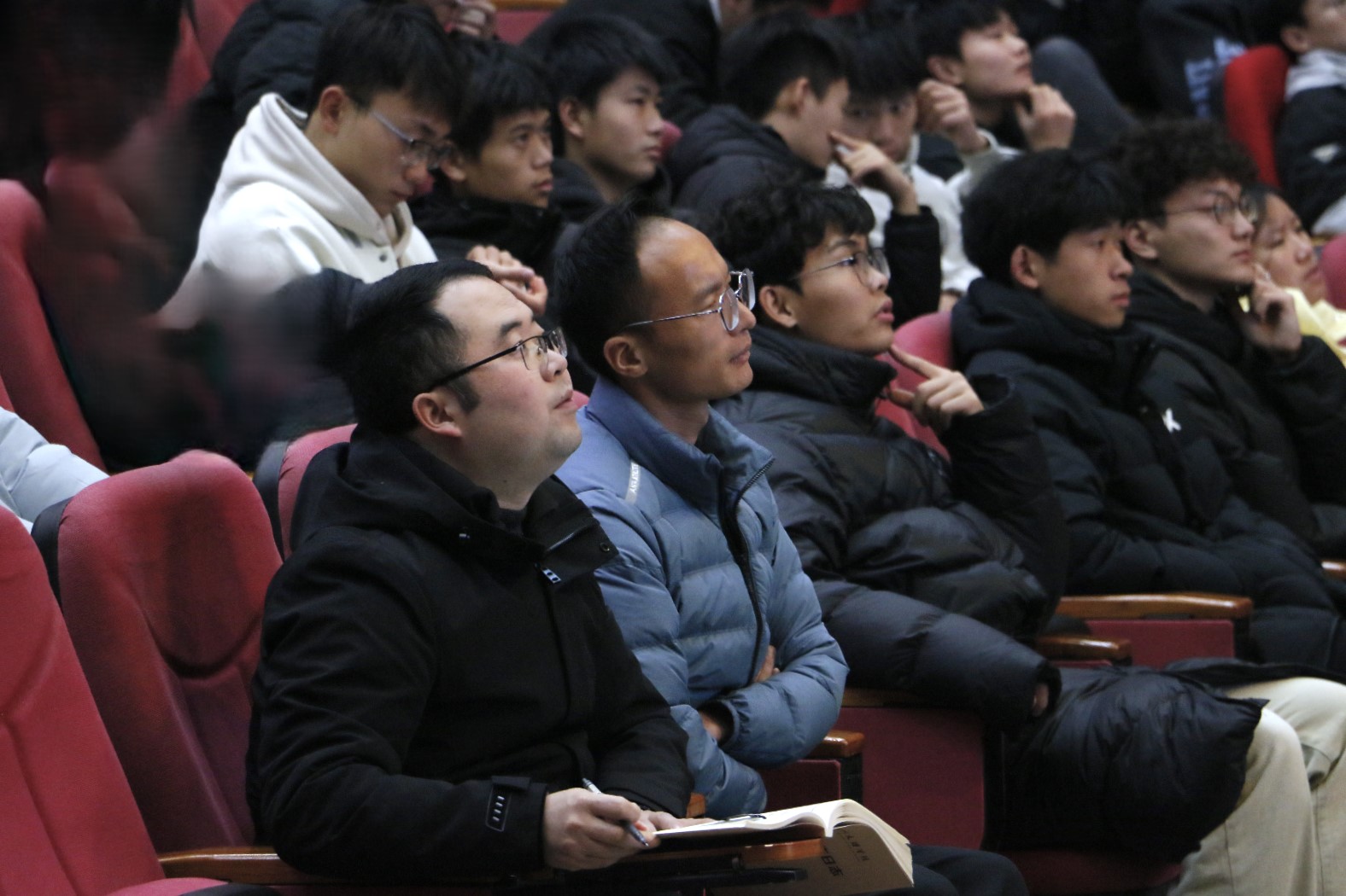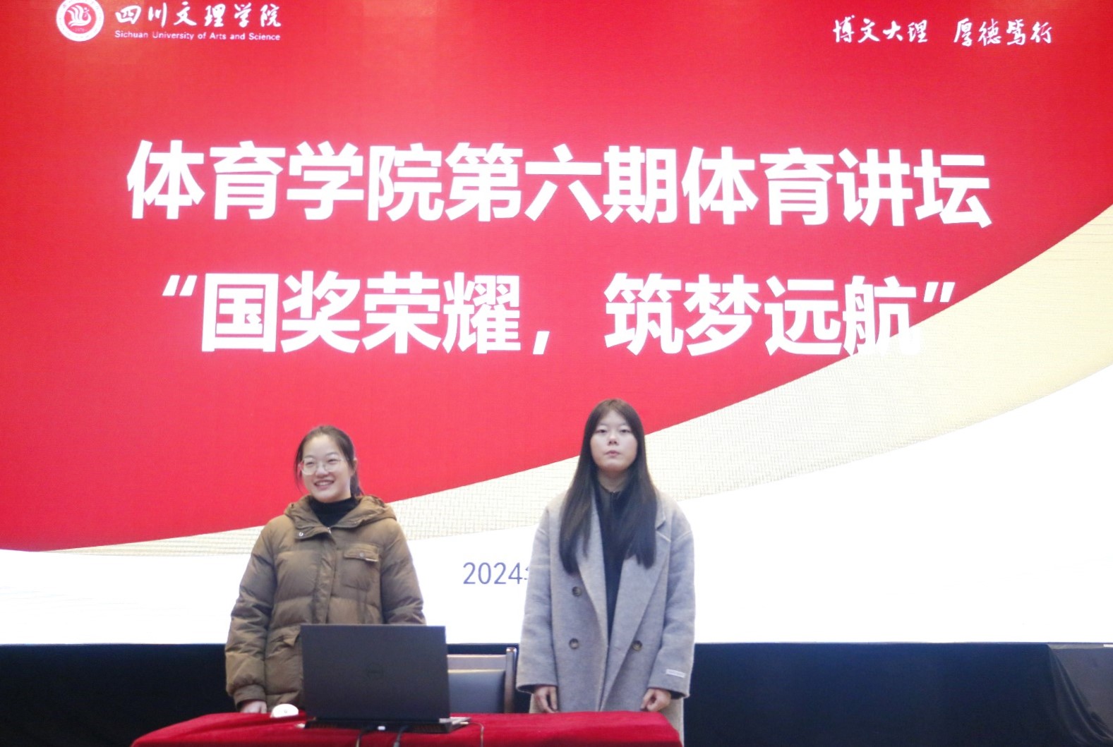20241225日晚上19:00,体育讲坛第六期在莲湖校区多功能厅开讲,国家奖学金获得者杨慧、李瑞敏担任主讲,2024级全体学生参与,专职辅导员邓超、李波出席活动。
